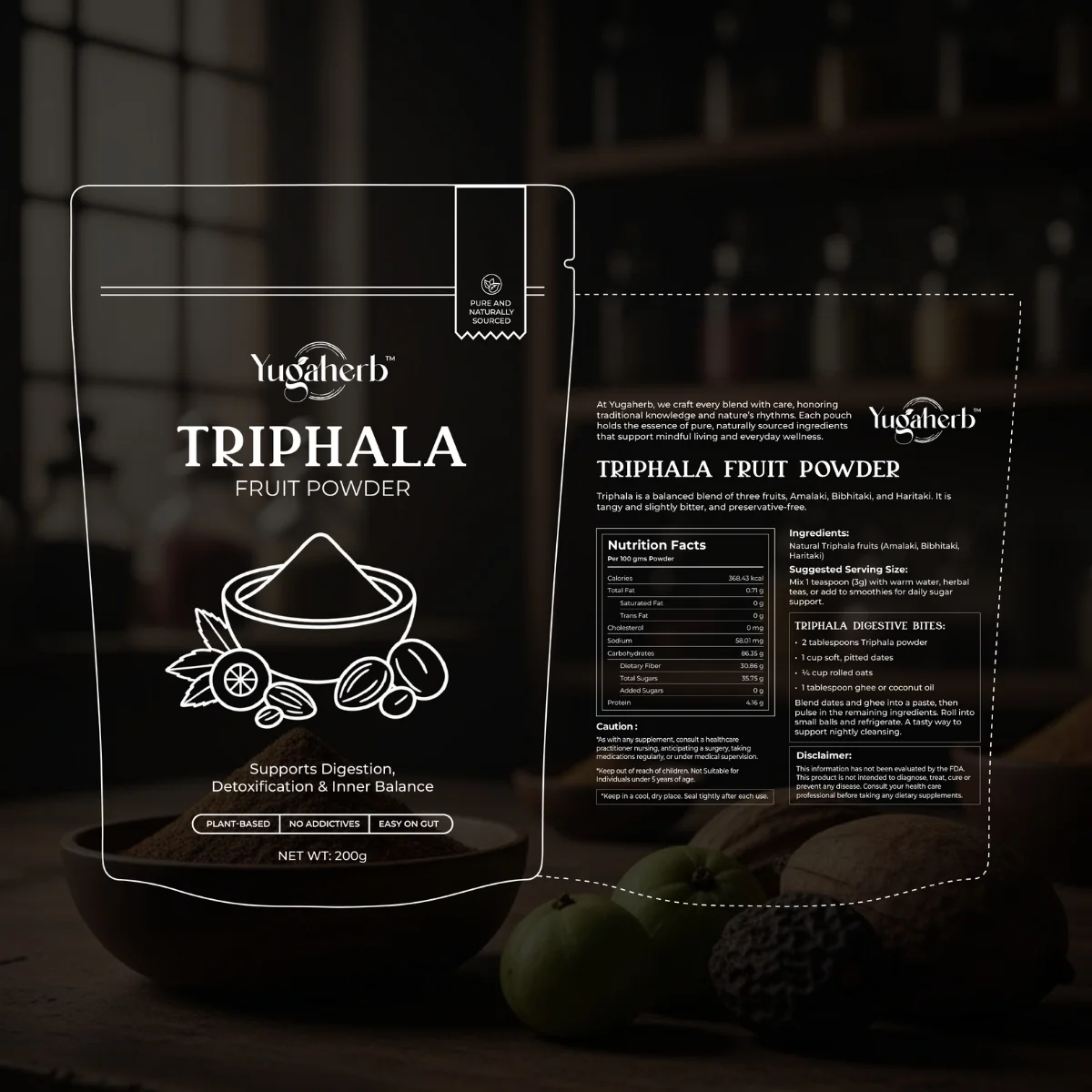 - A traditional Ayurvedic blend of three fruits: Amla, Haritaki, and Bibhitaki